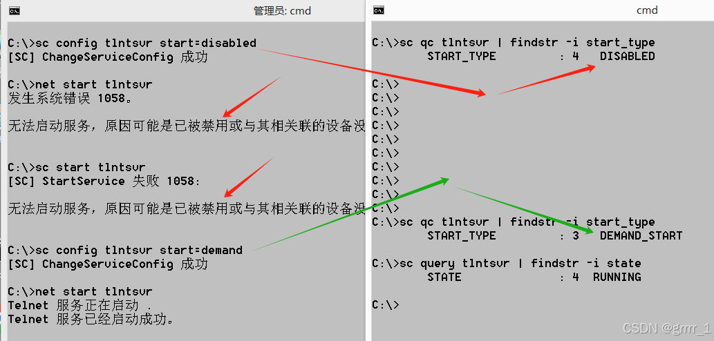 注意这些命令在使用的时候应该使用服务的 service_name ,而不是 display_name ,所以下面的命令是错误的,因为我们通过上面一长串的学习,知道了 telnet 的 service_name 是 tlntsvr。