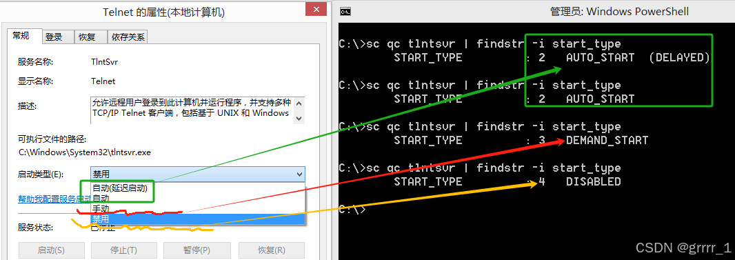 如果我们在服务里调整启动类型,那么对应的关系详见下图,下图用了sc qc 加上管道符和 findstr 过滤了输出结果: