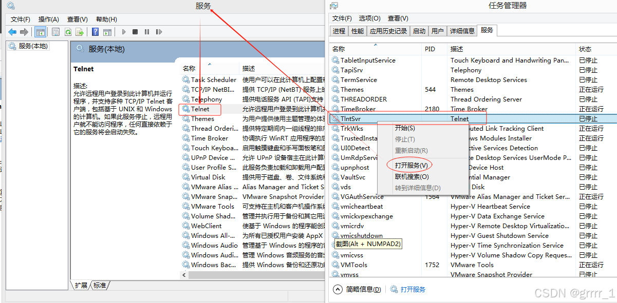 我们检查下 telnet 服务器有没有装好,打开任务管理器(Ctrl+Shift+Esc,或者 taskmgr 命令 ),下图左已经可以看到名称为 TlntSvr 描述为 Telnet 的服务已经出现,只不过现在的状态是“已停止”,我们鼠标右键可以打开服务(也可以用 services.msc )。