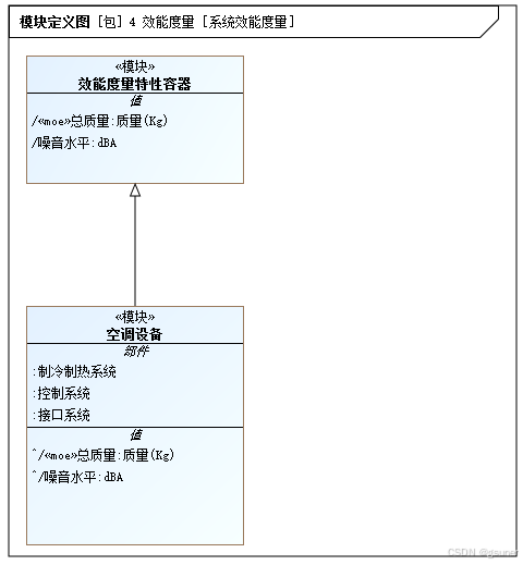 依据MagicGrid框架的结构,在B4模型中,对性能指标进行分析。如图4.4所示,将表示“总质量”和“噪音水平”的性能指标建模为一个容器类的值属性,并应用“效能度量”构造型(«moe»)。通过建立系统到这个容器类的继承关系,可以将这些表示性能指标的值属性传递到系统的任何层次结构。