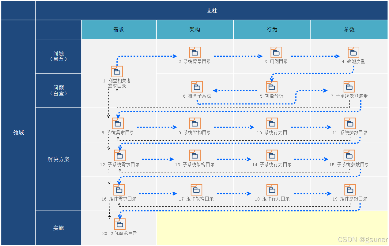 建模的流程如图中箭头所示的方向。大致是从上到下、从左向右的顺序。从问题域的需求分析、功能分解再到解决方案域的系统架构定义、系统行为逻辑分析,通过完整的建模分析过程表达系统架构设计的各维度信息。