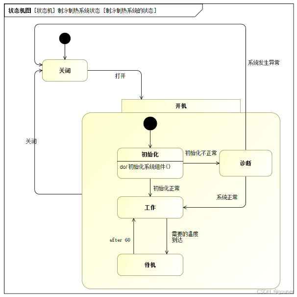 下面继续对子系统行为进行分析,进行子系统功能的设计。可通过建立子系统的状态机图,详细分析子系统工作状态的变化过程。并通过状态的内部行为,将整个子系统的功能活动串联起来。如图4.10所示,制冷制热系统的状态机模型如下。状态之间的转换可以由各种类型的事件触发,如时间变化、调用操作或信号事件等。大多数制冷制热系统状态之间的转移是由信号事件触发的。而每个状态内部也不是静止的,可能会有entry(进入)、do(执行)和exit(退出)行为,这些行为可能是另外一个表示功能的活动(图4.10)。