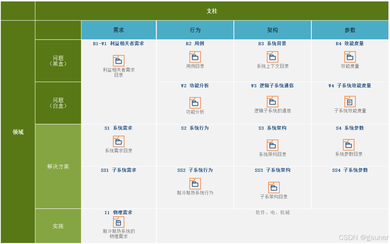 每个域在模型中考虑和捕获的四个方面与SysML建模语言的四大支柱相匹配,即需求、行为、架构和参数(也称为效能度量),它们表示为矩阵的列。行和列交叉处的单元格表示系统模型的视图,视图可以由一个或多个SysML图组成,可以是图、矩阵或表格。