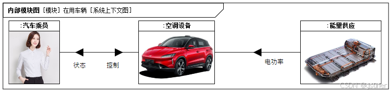 通过分析B1-W1模型中捕获的利益相关者需求,可以识别系统上下文。通过分析利益相关者对车辆气温控制的需求,能够识别系统上下文为“在用车辆”。创建SysML内部模块图来指定“在用车辆”系统上下文中的构成。在这个内部图中,在用车辆上下文包括“空调设备”和执行者“汽车乘员”。同时,系统上下文中需要一个为系统提供能量的外部系统“能量供应”模块,如图4.2所示。