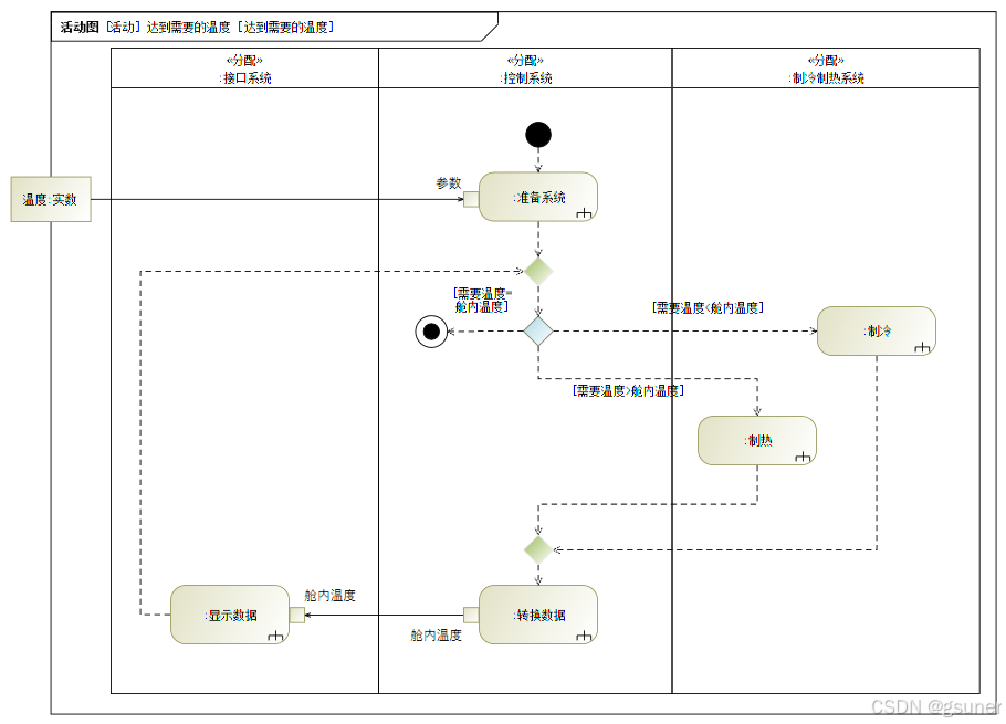 当模型中有了获得舒适温度用例的整个场景后,可以指定相关系统上下文的某个组成部分负责执行某个操作,也就是将行为分配给上下文中的结构。对此,可以使用分配活动分区来表示系统上下文的组成部分。分配活动分区代表的元素是系统上下文的部件属性。