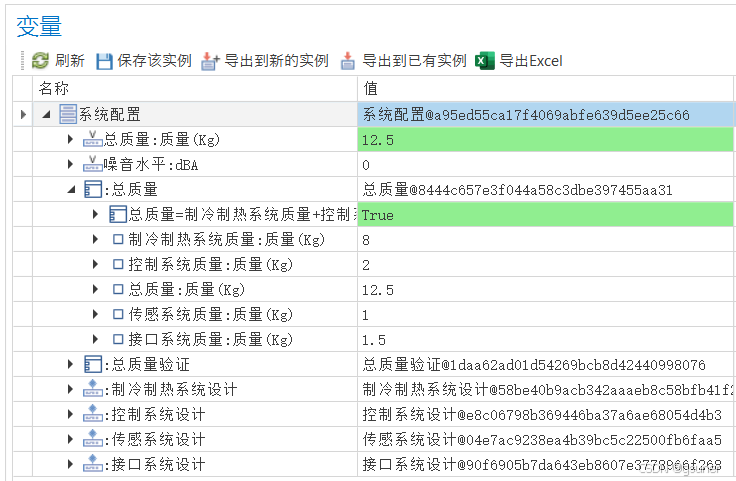 通过参数图的仿真计算,能够计算出系统的总质量数据,并根据上图中“{tm<=25}”约束,对总质量是否满足需求进行自动的验证(下图仿真结果变量表中绿色表示满足约束,红色表示不满足)。