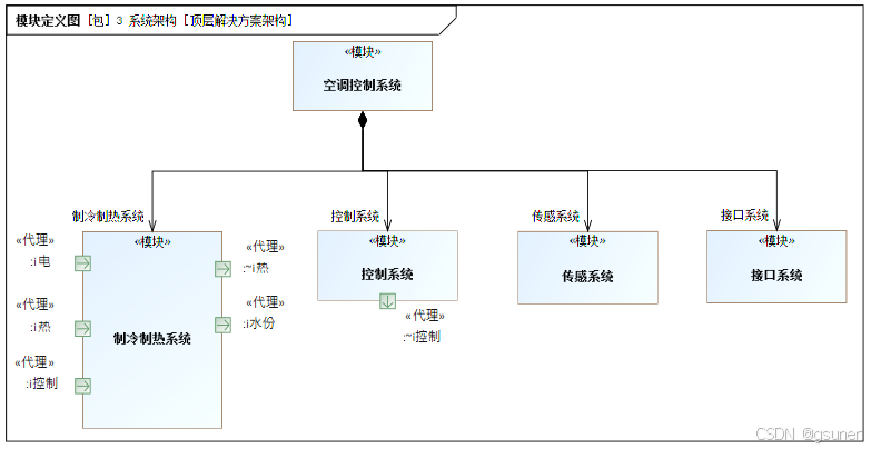 接下来对系统架构进行初始化分析,通过创建模块定义图(BDD)建立空调设备的顶层解决方案架构及子系统。子系统由制冷制热系统、控制系统、传感系统和接口系统组成,如图4.8所示。图中也定义了每个子系统的端口和接口模块类型,作为总体架构的设计标准。