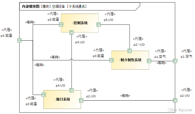 在W3模型中,对逻辑子系统之间的通信接口关系进行分析。组成空调设备的逻辑子系统主要包括:控制系统、制冷制热系统、接口系统,如图4.6所示。在这个图中,外框代表“空调设备”,外框上的端口连接到内部部件属性节点上的端口,使用绑定连接器。端口的接口模块类型一样,它表示外层端口和内层部件属性节点上的端口其实是同一个东西。“代理”的意思,就是外部的端口是虚拟的,其实是有内层部件上的端口(或一个模块)实现的。不同的部件属性节点之间的连接关系,端口的接口模块类型是“共轭”的,表示接口模块中的流属性类型相同,但是方向相反。例如,控制信号从一个端口发出(流出),对应另外一端必须是接收(流入)。