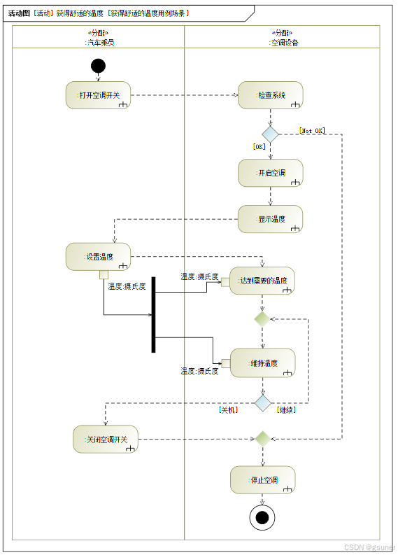 接下来使用用例来完善功能性利益相关者需求。用例场景可以应用SysML活动图或序列图详细的建模。以“获得舒适的温度”用例场景为例,应用图4.3所示活动图进行详细场景的描述。