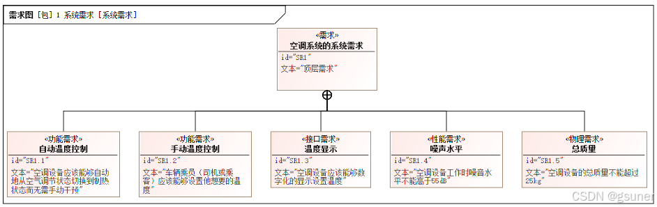 创建系统需求图,如图4.7所示。系统需求是系统实现方案的条目化说明。它是在经过详细的系统功能分析、逻辑架构分析基础上,总结出的更明确的设计要求。为了跟踪需求的实现过程,应该创建导出需求矩阵,建立系统需求到利益相关者需求的追溯关系。在理想情况下,每个系统需求都必须在后续的解决方案域模型中得到体现,并且每个元素都必须根据一个或多个系统需求来优化。否则,必须修订和更新系统需求。