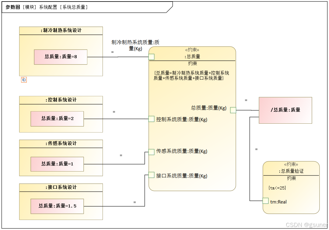 另外一个集成验证的工作是各子系统的性能指标合成后的系统性能指标是否满足系统需求中的性能需求。这个通过建立顶层系统配置模块的参数图、参数图仿真来验证。如通过下面建立的子系统质量和系统总质量之间的加和关系约束方程,以及参数图来进行系统总质量的计算。参数图的作用本质上是把系统中某个值属性代入到约束模块的约束方程中进行计算。等式形式(一个=号)的约束在参数图仿真时起到了赋值的作用,而不等式(或两个=号)的约束在参数图仿真时起到了验证计算出的性能指标是否满足要求的作用。计算空调设备总质量的参数图如图4.11所示: