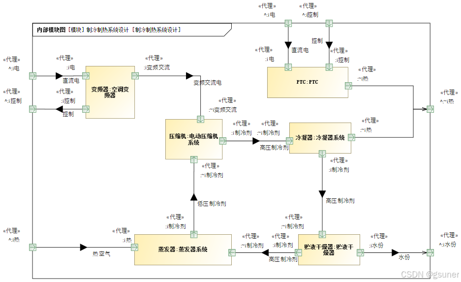 接下来对子系统架构进行分析,以构建制冷制热系统的解决方案架构为例,如图4.9所示。子系统由更下层的组件组成,子系统的内部模块图说明这些组件的连接关系。外框表示的是子系统,外框上的端口是从顶层解决方案架构中的子系统继承的,原则上是不能改变它们的接口模块类型,以保持和顶层解决方案设计的一致性。在连接端口的连接器上,黑色的三角箭头表示连接器上流过的“项目流”,表示在两个组件之间传递的信号或某种物理量。