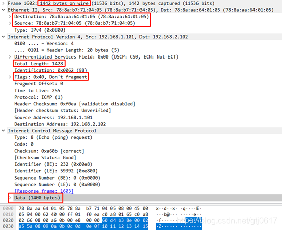 数据长度为1400字节,ICMP报文标志位长度为8字节,再加上IP报文头的20字节,长度正好是1428字节,也就是[INNER-IP][DATA]的长度为1428字节。外层的14字节的以太网封装,进入设备之后就脱掉了,但是依然可以看到最外层封装的源MAC地址为PCA的MAC地址,目的MAC地址为网关设备的MAC地址。