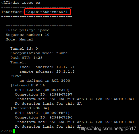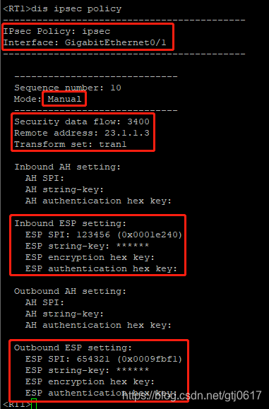 3、ESP配置中的SPI和SA在两台IPsec网关设备的出入方向相反,需要注意。