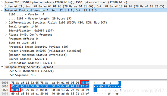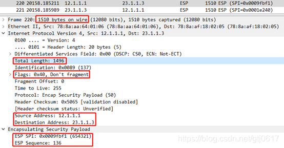 抓包发现IPsec设备发出的报文大小为1510字节,其中包含14字节的以太网报文头封装,内部数据长度为1496字节。还可以看到DF标志、隧道的源目地址以及ESP SPI等信息。