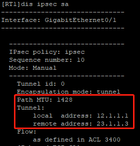 查看IPsec SA信息时,隧道下有一行Path MTU: 1428的信息,那就来验证一下MTU的大小吧。