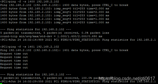 测试发现实际最大能通过的报文大小为1400字节,1401字节及更大的报文无法通过。