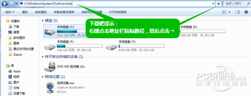 hosts文件位于 C:\Windows\System32\drivers\etc 。复制路径,打开桌面上的计算机图标,地址栏点击右键粘贴并按→。