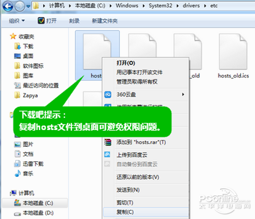步骤1、右键点击hosts文件,选择复制,然后粘贴到桌面上。