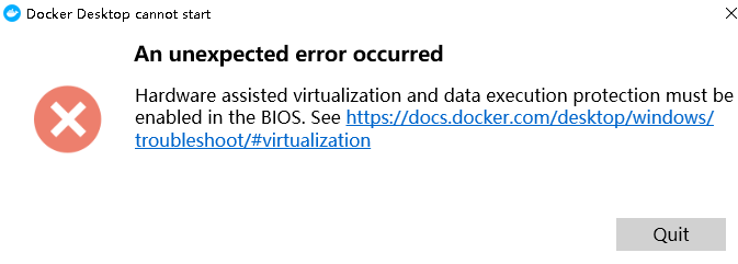 Hardware assisted virtualization and data execution protection must be enabled in the BIOS