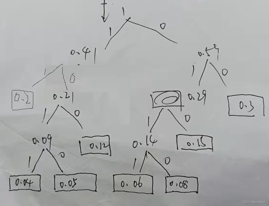 画出来,基本上就是这样的子的,方框表示的就是实际的指令使用频度,然后求其平均码长 $H=\sum_{i=1}^n p_i*l_i$//li:表示的就是指令的编码长度,如0.3,从1数要走两步才能到0.3,所以0.3的码长为2.