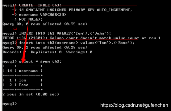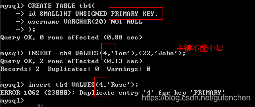 例2:mysql>CREATE TABLE tb4(id SMALLINT UNSIGNED PRIMARY KEY,username VARCHAR(20) NOT NULL);