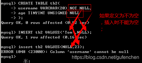 例如:mysql>CREATE TABLE tb2(username VARCHAR(20) NOT NULL, age TINYINT UNSIGNET NULL);