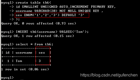 ->username VARCHAR(20) NOT NULL UNIQUE KEY, sex ENUM('1','2','3')default '3');