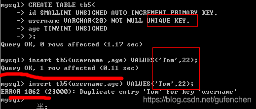 mysql>INSERT tb5(username,age) VALUES('Tom',22);错误,重名