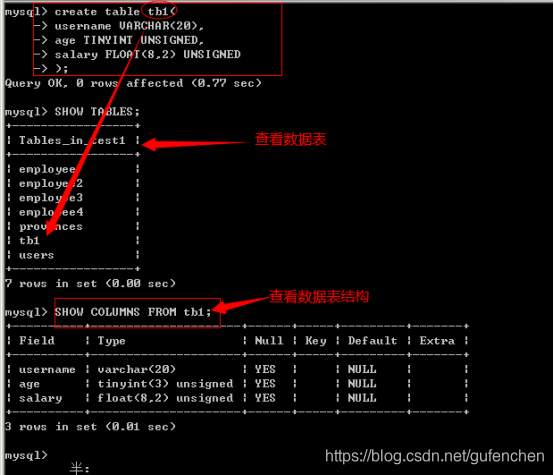 例子:mysql>CREATE TABLE tb1(username VARCHAR(20),age TINYINT UNSIGNED,salary FLOAT(8,2) UNSIGNED);