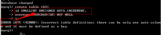 例:mysql>CREATE TABLE tb3(id SMALLINT UNSIGNED AUTO_INCREMENT,username VARCHAR(30) NOT NULL);不能创建成功 X;