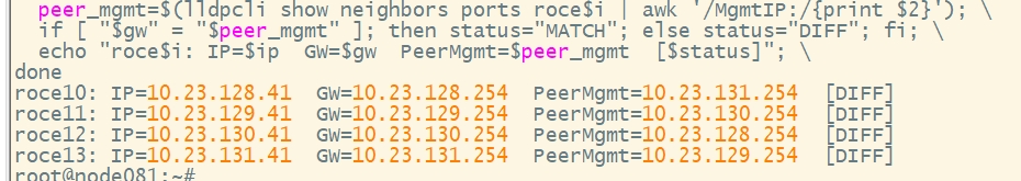 bash -c 'echo "Interface IP Address Gateway PeerMgmtIP PeerSysName PeerPort Status"; echo "-------------------------------------------------------------------------------------------------------------------------"; for i in {10..13}; do ip=$(ip -4 addr show roce$i | awk "/inet /{print \$2}" | cut -d/ -f1); gw=$(echo $ip | awk -F. "{print \$1\".\"\$2\".\"\$3\".254\"}"); peer_mgmt=$(lldpcli show neighbors ports roce$i | awk "/MgmtIP:/{print \$2}"); peer_sys=$(lldpcli show neighbors ports roce$i | awk "/SysName:/{print substr(\$0,11)}"); peer_port=$(lldpcli show neighbors ports roce$i | awk "/PortID:/{print substr(\$0,15)}"); [ "$gw" = "$peer_mgmt" ] && status="MATCH" || status="DIFF"; printf "%-10s %-15s %-15s %-15s %-20s %-25s %-6s\n" "roce$i" "$ip" "$gw" "$peer_mgmt" "$peer_sys" "$peer_port" "$status"; done'
