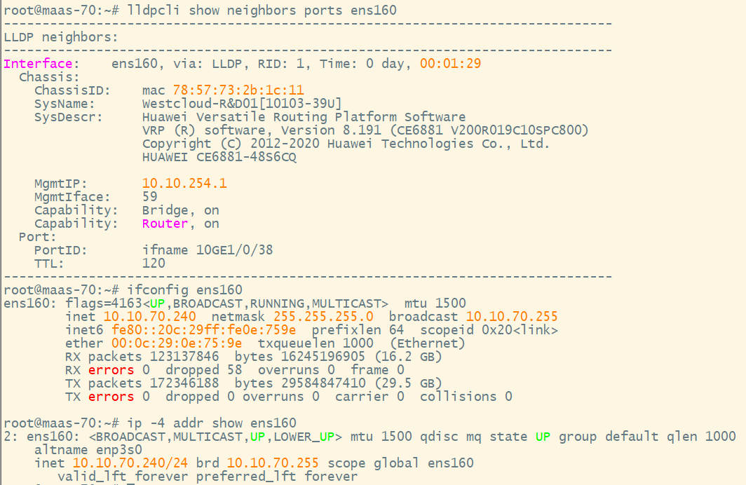 查看每个网卡的对端交换机信息(管理 IP、设备名、端口号)。