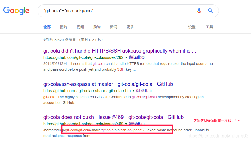 这个时候再使用 git-cola 进行 pull 等操作依旧是上面的错误信息,此时有点“懵逼”;这个时候就求助百度吧,但是好像文章都是说的我上一步的操作,算了,还是使用靠谱的 Google + Google Hacking: