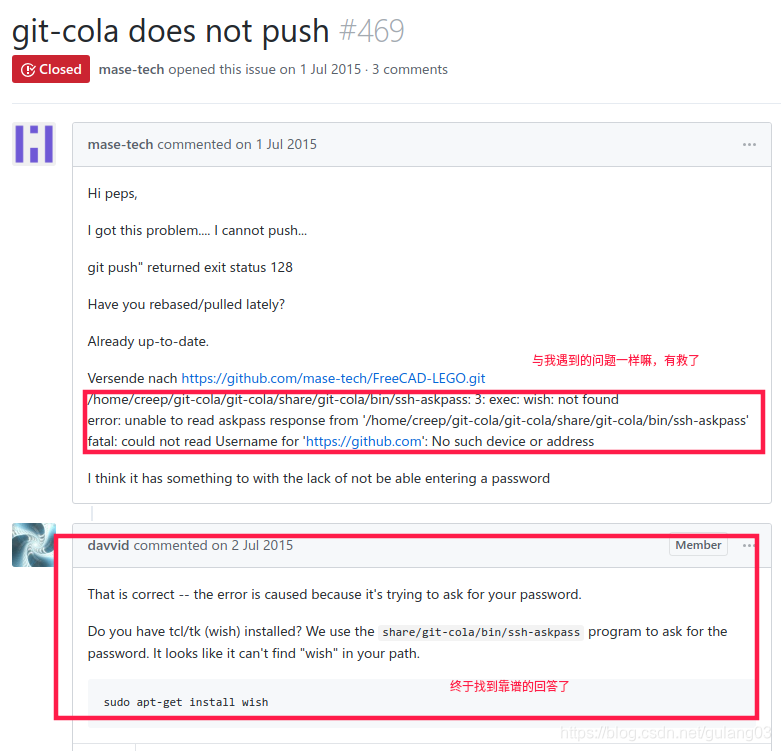 在Linux使用git-cola时遇到错误提示/usr/share/git-cola/bin/ssh-askpass: 3: exec: wish: not found。解决方法是安装wish组件,而非ssh-askpass。错误提示表明缺少wish用于用户交互。安装wish后,问题解决。注意错误提示的准确性,避免不必要的误解和操作。