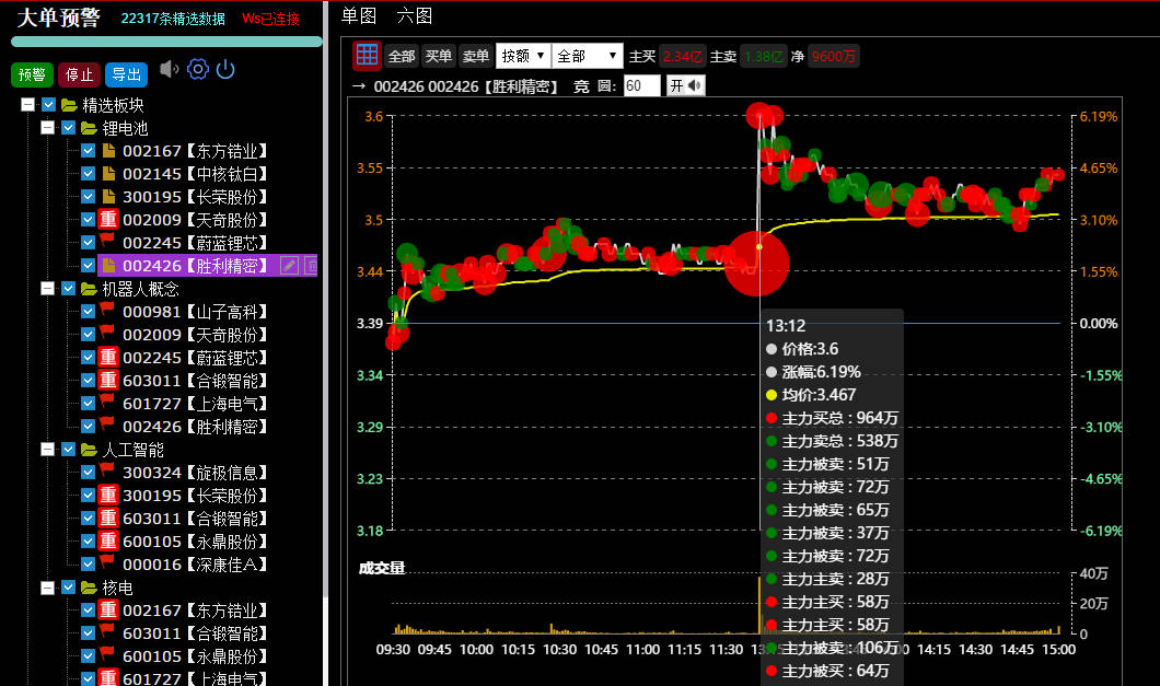 这是一款傻瓜式、入门级大单资金实时监控与播报插件,可内嵌于通达信定制版面或个股分时图版面,与版面联动。当点击个股时,显示该股大单资金实时买卖情况,支持设置大单金额范围和查看单笔资金明细。插件以圆圈大小代表资金量,红球为主力买单,绿球为主力卖单,顶端设有全局统计功能,并可开启声音播报(300 万以上大单有人声提示)
