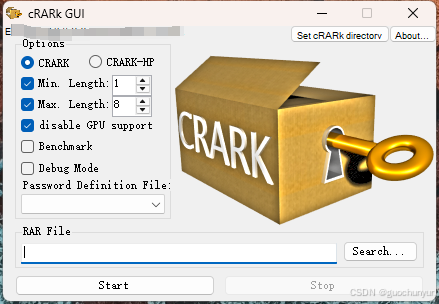 在下载的文件中找到 crark_gui 文件夹 并将此文件夹下的 cRARk GUI.exe 拷贝到 cRARk.exe 同一目录,双击运行 cRARk GUI.exe,界面如下: