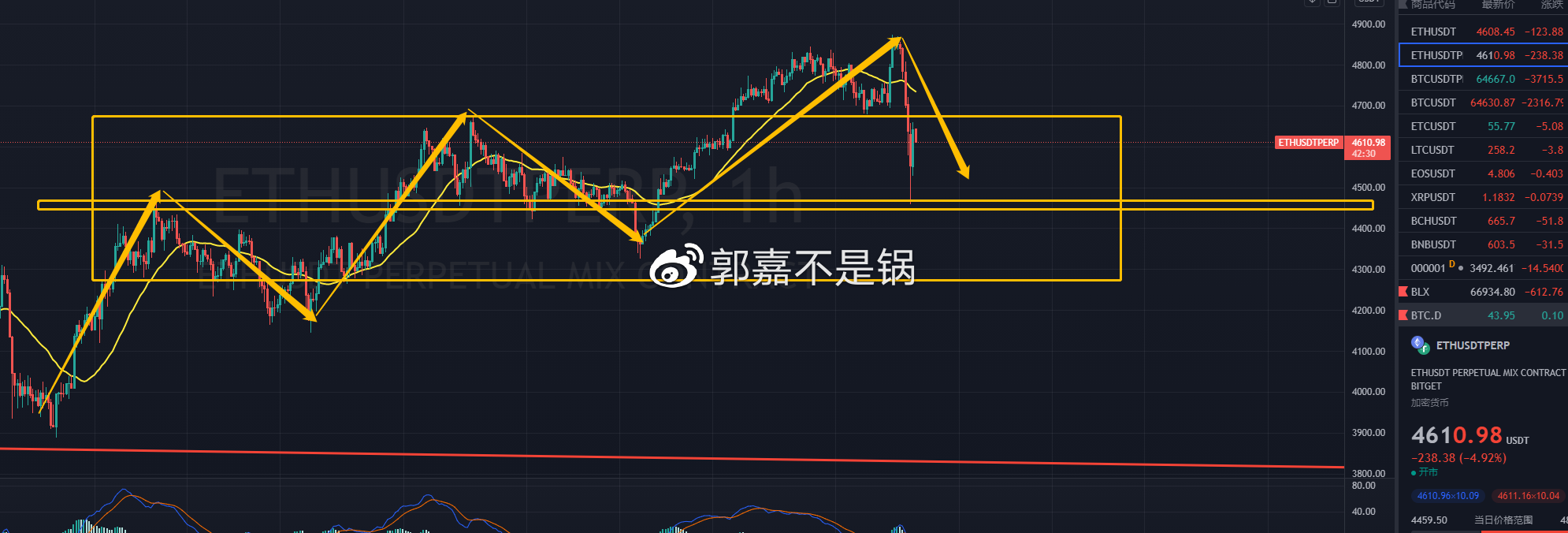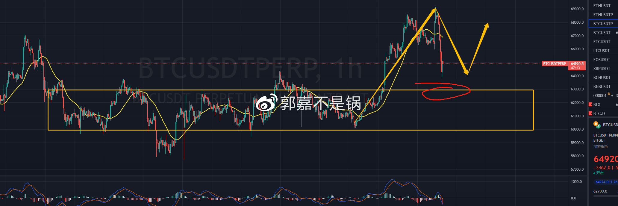 大饼1H的结构,目前是一笔1H的回踩。核心是不能够在跌破62500这个位置了。如果跌破了的话那么风险就极大,而且日线级别还面临的日线顶背的风险,所以面对种种风险的话,这几天就核心观察62500的得失,如果跌破了的话那么现货必须离场,不然日线一旦顶背,所面临的调整也好风险也罢会特别的大。