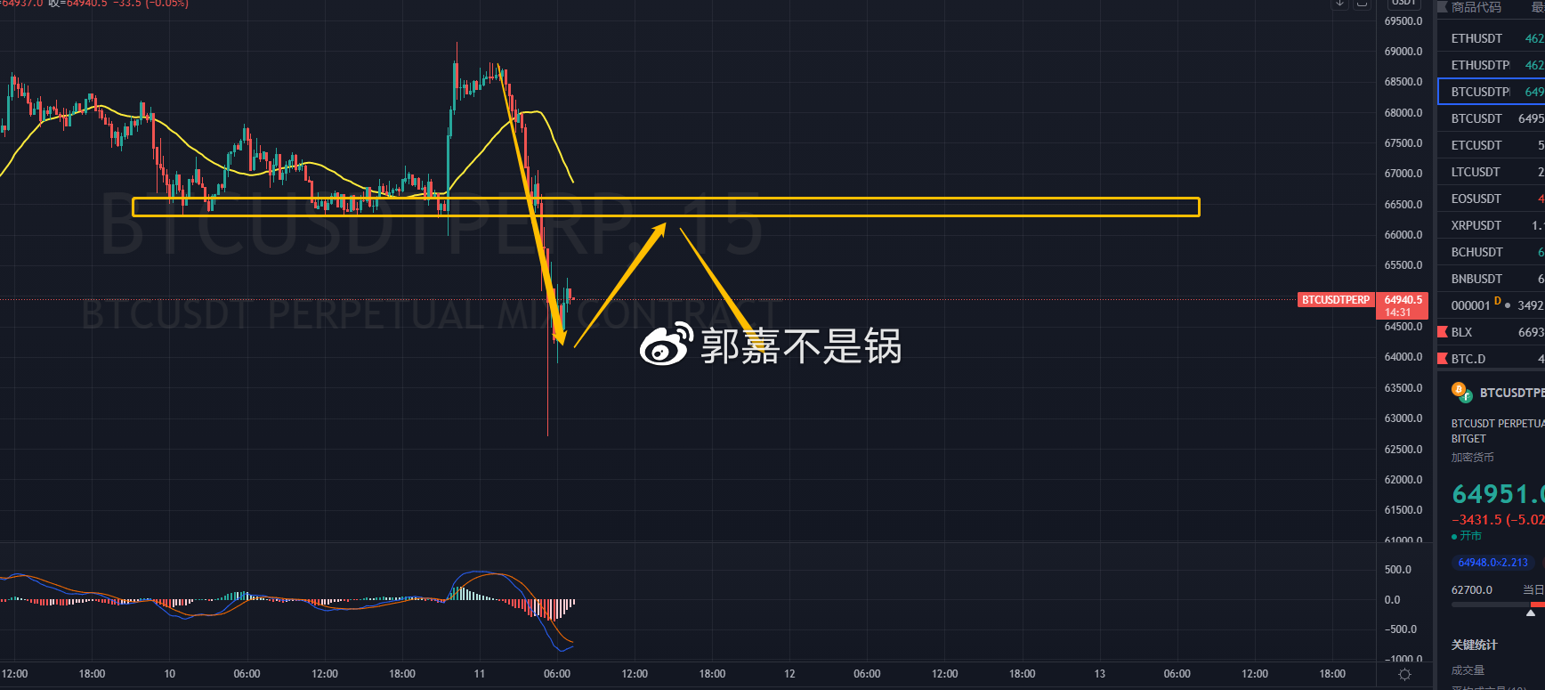 大饼15F的结构,15F的结构的话目前只运行了第一笔1H的下跌,后面反弹如果不能突破66000的话则是15F的三卖。所以从1H级别-15F的级别都是面临的调整的走势,所以短期做多是不能够入场的。需要耐心等待市场走完这笔1H的下跌,核心观察1H的中枢上沿是否能够守住。