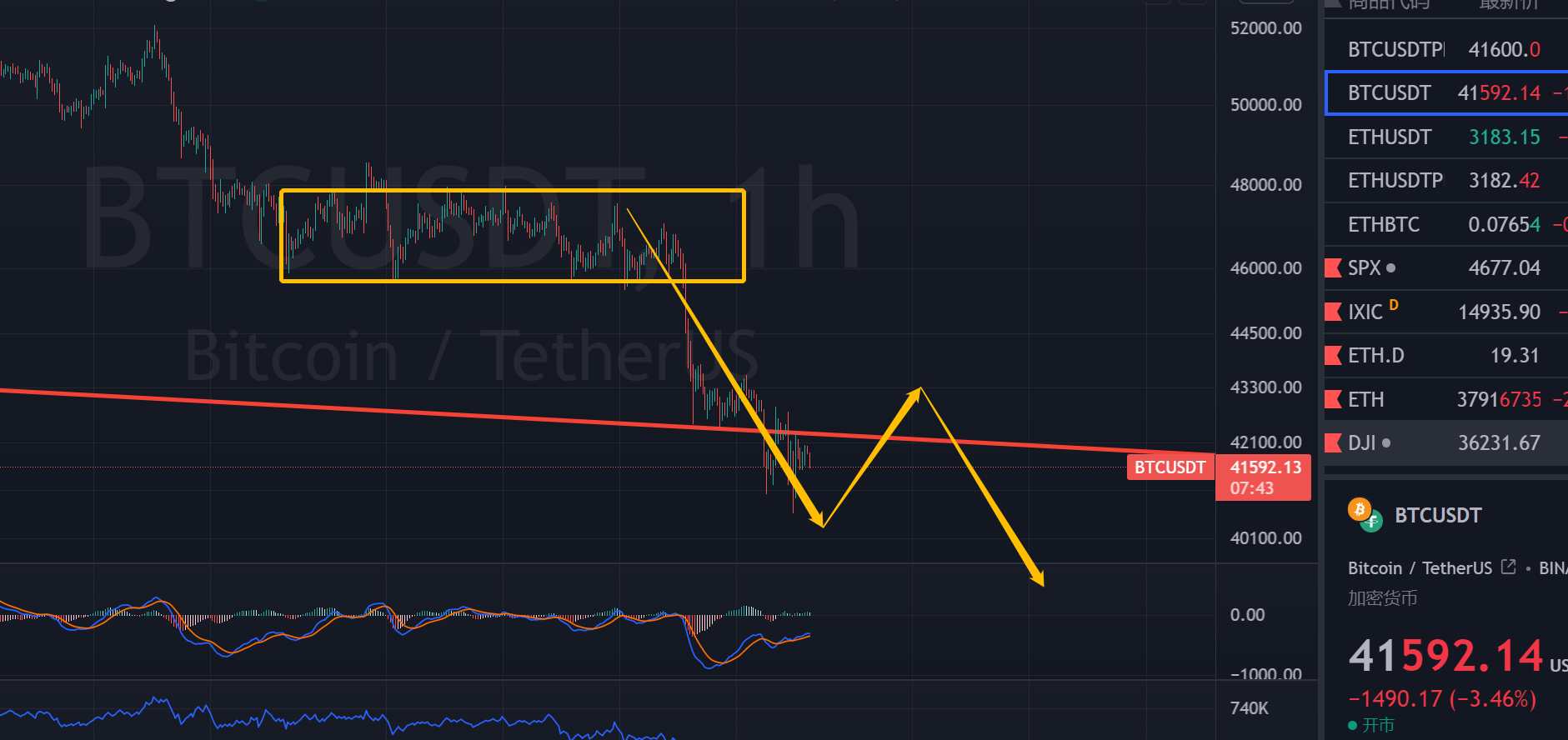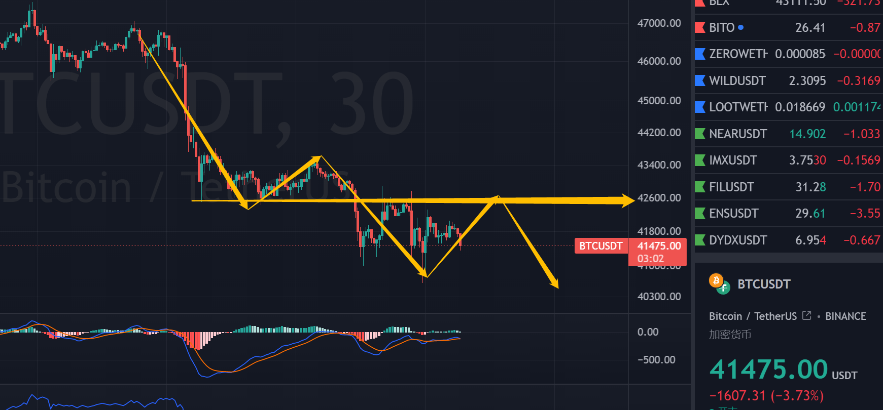 大饼30F的走势,目前大饼依然还是在第三笔30F的下跌的走势之中,如果后面的反弹不能够突破黄色压力线的话那么走势更加的弱,突破黄色压力线的话后面1H的反弹才能够到43500-44500这个区间,否则继续下跌为主。