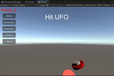 可以看到明显的碰撞效果的产生,这是因为飞碟物理运动是通过设置刚体来完成的,这与原本的运动学的运动不同,后者不包含碰撞。