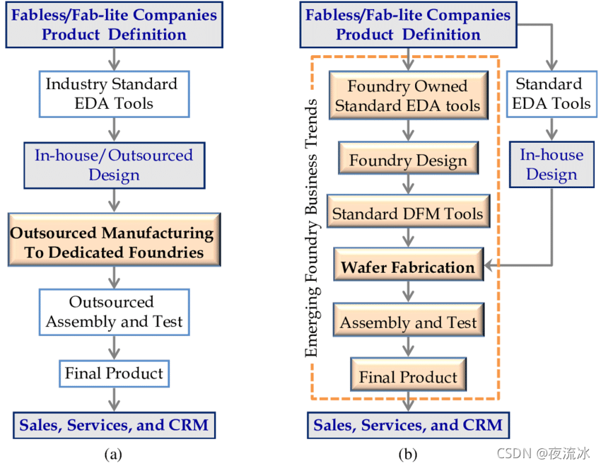 下图表示以前和现在的芯片制造流程对比: