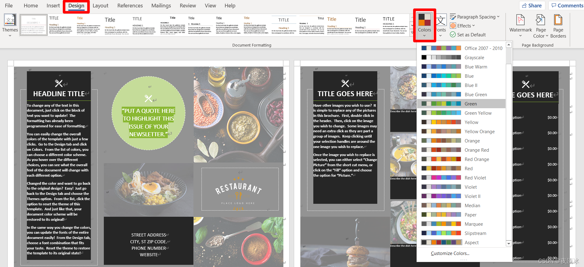 如果更改颜色,直接在设计选项卡里选择颜色。选择某一套色彩后,此模板文件中的相应元素的颜色都会跟着改变。