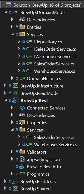 如您所见,其中有一点 DDD。正如您应该已经发现的那样,有很多耦合,因为所有内容都在特定常见项目的单个文件夹中。例如,BrewUp.DomainModel 包含一个名为 Services 的文件夹,其中包含销售和仓库服务。