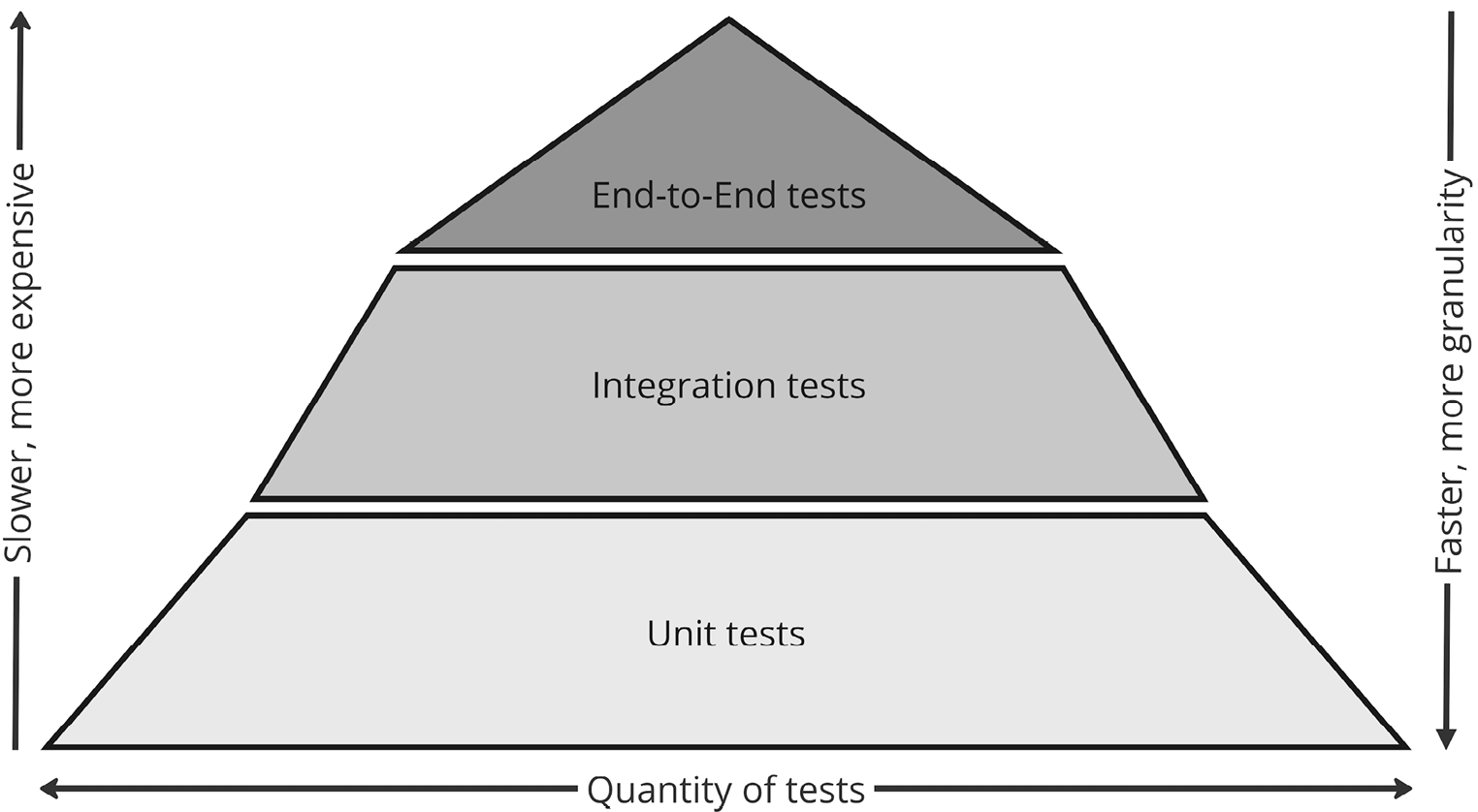 In Figure 5.4, you can see the famous pyramid of tests, a concept that visualizes the optimal distribution of different types of tests in your code base.