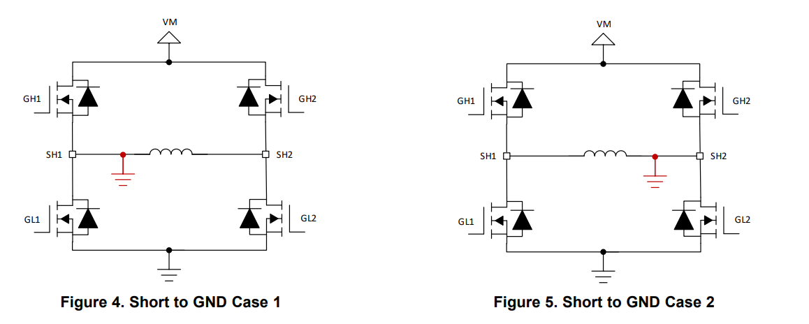 The Figure 4 and Figure 5 show the short to ground scenarios. If the motor were to drive forward (only GH1 and GL2 are on) in Short to GND Case 1, the high current through GH1 would trigger that FET’s VDS monitor for an OCP event. Similarly, if the motor were to drive in reverse (only GH2 and GL1 are on) in the Short to GND Case 2 scenario, GH2’s VDS monitor would trigger an OCP event.