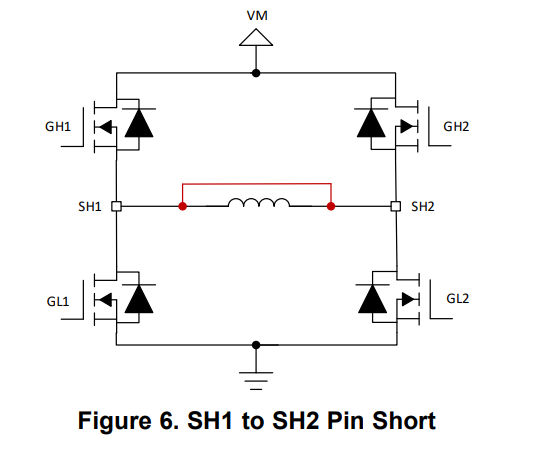 Lastly, the SHx pins can be shorted to each other due to poor soldering, poor terminal connections, or a short in the motor windings. In this scenario, the VDS monitors across any driving FET will detect an OCP condition. For example, when driving forward (only GH1 and GL2 are on) the VDS monitors across FETs GH1 and GL2 will detect an OCP condition.