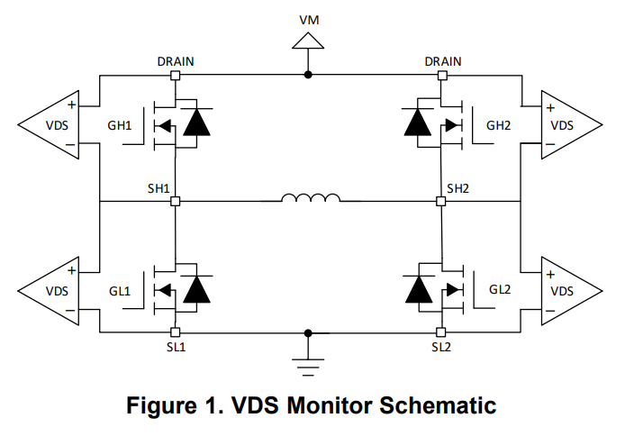 VDS monitors are connected at the drain and source of the FET. The voltage across the drain and source provides information on how much current is running through each FET. As shown in Figure 1, each FET has its own VDS monitor.