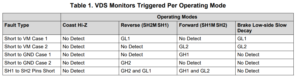 Once the desired specifications for VDS monitoring are set, the device is ready to detect faults. Three reasons an OCP condition occurs is the H-bridge outputs (SHx) are either shorted to ground, shorted to the supply voltage, or shorted to each other. The type of short can be identified depending on which VDS monitor detects the OCP condition.