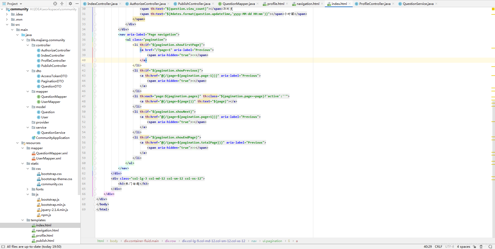 最近放假在家,终于有时间学习springboot了,当下最流行的java框架,我还没有接触过,有点遗憾,看过尚硅谷雷丰阳老师的springboot基础整合篇,现在轮到项目整合了,在B站发现一个码匠社区项目挺好的,最近刚完成了分页部分的练习,居然没用插件,直接原生代码,有点牛笔。